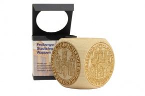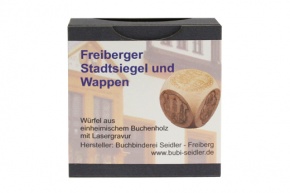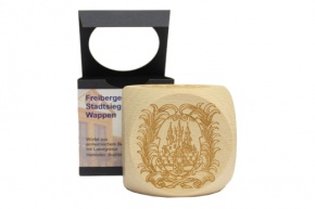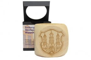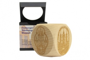 Holzwürfel aus FSC zertifiziertem Holz mit 6 Freiberger Stadtwappen bzw.