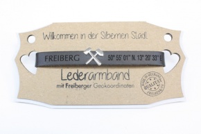 Lederarmband aus Rinds-Spaltleder, ca. 1 cm breit und 25 cm lang, mit vier Befestigungslöchern und einer Knopfschraube aus Edelstahl, Schriftzug Freiberg und Geo-Koordinaten lasergraviert.