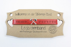 Lederarmband aus Rinds-Spaltleder, ca. 1 cm breit und 25 cm lang, mit vier Befestigungslöchern und einer Knopfschraube aus Edelstahl, Schriftzug Freiberg und Geo-Koordinaten lasergraviert.