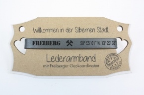 Lederarmband aus Rinds-Spaltleder, ca. 1 cm breit und 25 cm lang, mit vier Befestigungslöchern und einer Knopfschraube aus Edelstahl, Schriftzug Freiberg, Hammer & Schlägel sowie Geo-Koordinaten lasergraviert.