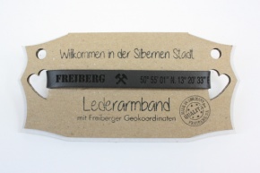 Lederarmband aus Rinds-Spaltleder, ca. 1 cm breit und 25 cm lang, mit vier Befestigungslöchern und einer Knopfschraube aus Edelstahl, Schriftzug Freiberg, Hammer & Schlägel sowie Geo-Koordinaten lasergraviert.
