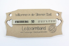 Lederarmband aus Rinds-Spaltleder, ca. 1 cm breit und 25 cm lang, mit vier Befestigungslöchern und einer Knopfschraube aus Edelstahl, Schriftzug Freiberg, Hammer & Schlägel sowie Geo-Koordinaten lasergraviert.