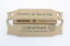 Lederarmband aus Rinds-Spaltleder, ca. 1 cm breit und 25 cm lang, mit vier Befestigungslöchern und einer Knopfschraube aus Edelstahl, Schriftzug Freiberg, Hammer & Schlägel sowie Geo-Koordinaten lasergraviert.