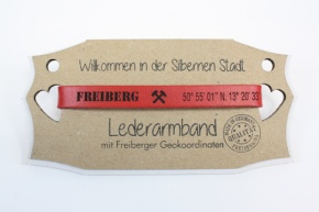 Lederarmband aus Rinds-Spaltleder, ca. 1 cm breit und 25 cm lang, mit vier Befestigungslöchern und einer Knopfschraube aus Edelstahl, Schriftzug Freiberg, Hammer & Schlägel sowie Geo-Koordinaten lasergraviert.