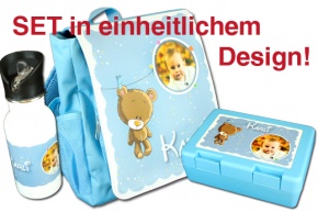 Rucksack, Trinkflasche und Frühstücksdose werden in gleichem Design bedruckt (jeweils auf das Produkt angepasst). Der Druck erfolgt mittels Sublimationsdruck.