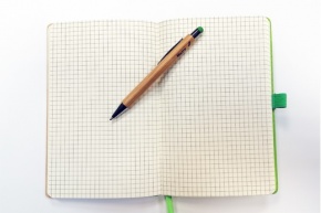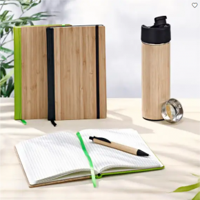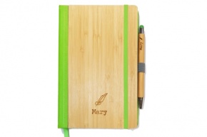 Mit farblich passendem Verschluss- und Lesezeichenband sowie Bambuskugelschreiber mit Touchfunktion in Stiftschlaufe.