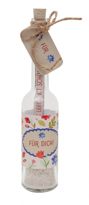 Glasflasche, 0,1 l, Höhe ca. 20 cm, Durchmesser ca. 4 cm, mit Korkverschluss und Geschenkanhänger Inhalt: Grußbotschaft gerollt, mit Platz für eigene Grüße ca. 14,5 x 7 cm, vierfarbig, gereinigter Sand, 4 x 20 cm