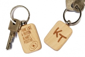 Anhänger aus Buchenholz, ca 45 x 30 mm, mit Gravur deiner Initiale auf der Vorderseite und Grafik "Think like a Proton. Always posive."" auf der Rückseite.