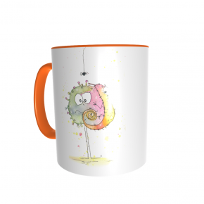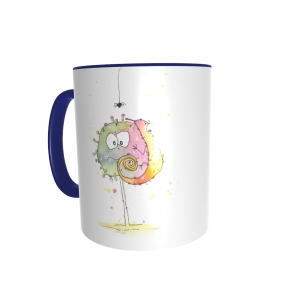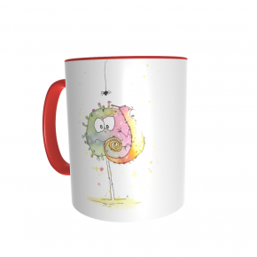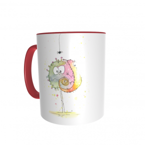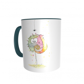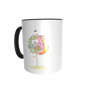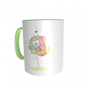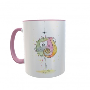 Diese Tasse ist nur für Dich: Vorn ist PaintBug und Chamäleon aufgedruckt, auf der anderen Seite dein Name. Die Tassen sind weiß mit farbigem Griff und Rand, die Schrift deines Namens hat die selbe Farbe wie der Griff.